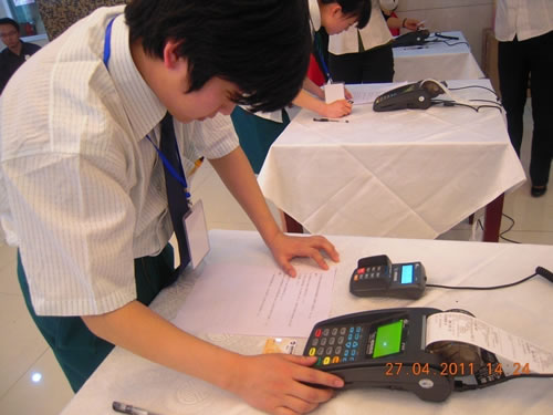 參賽選手熟練、準確無誤的操作POS系統(tǒng),做到刷卡流程準確、速度穩(wěn)定