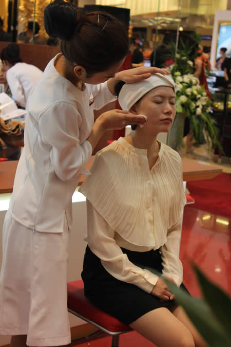 嬌韻詩專柜導(dǎo)購(gòu)用專業(yè)手法為顧客現(xiàn)場(chǎng)做植物精華護(hù)理