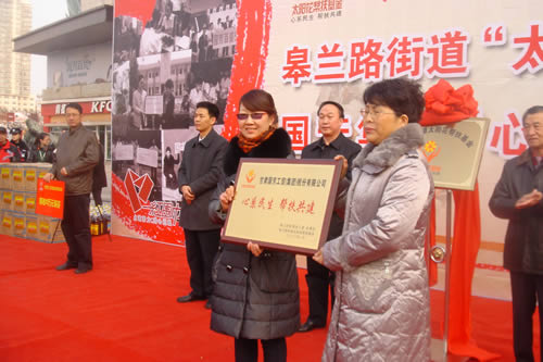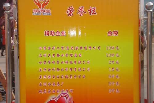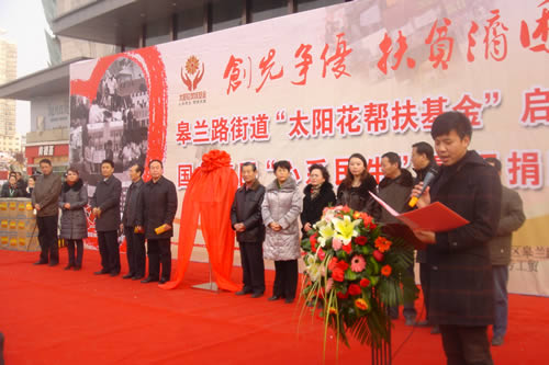 2012元月6日下午3時,甘肅國芳集團聯合城關區(qū)皋蘭路街道黨工委、辦事處舉行了“創(chuàng)先爭優(yōu)、扶貧濟困”太陽花幫扶基金啟動儀式,充分體現民生為本的服務宗旨,著力搭建社會幫扶救助平臺,切實解決弱勢群體實際困難,促進和諧街道建設。