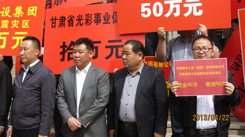 2013年4月22日下午15時,在甘肅省政協(xié)一樓,由甘肅省委常委、省委統(tǒng)戰(zhàn)部部長澤巴足,省委統(tǒng)戰(zhàn)部副部長、甘肅省工商聯(lián)黨組書記、第一副主席吳繼德等相關領導出席了“甘肅省商會非公經濟人士向四川雅安災區(qū)獻愛心捐贈儀式”。捐贈現(xiàn)場眾多甘肅省非公企業(yè)向4月20日雅安市地震災區(qū)進行了捐贈,廣大愛心企業(yè)和人士用自己的實際行動對災區(qū)同胞奉獻了自己的真情和祝福。