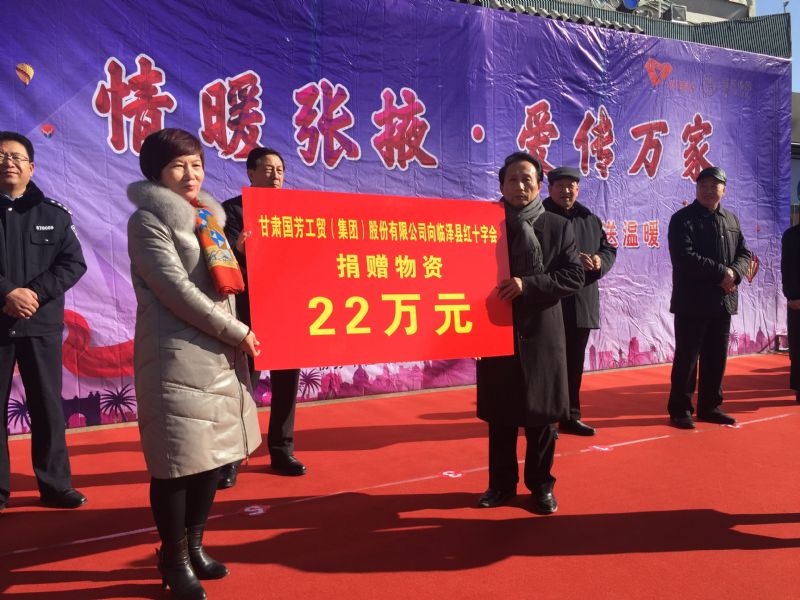2019年1月11日,甘肅省慈善總會、張掖市慈善協(xié)會、甘州區(qū)慈善協(xié)會以及臨澤縣紅十字會攜甘肅國芳工貿(mào)(集團)股份有限公司在張掖市中心廣場共同舉行“情暖張掖·愛傳萬家”送健康送溫暖活動,將2000套棉衣,2000余套秋衣秋褲,27臺彩電以及300余件小家電合計價值148萬元的過冬物資帶給山丹縣,民樂縣的困難群眾,將2500個醫(yī)藥箱帶給臨澤縣的老人們。此次活動傳導(dǎo)社會幫扶、精準扶貧精神的同時也默默為社會傳導(dǎo)著一份正能量。
