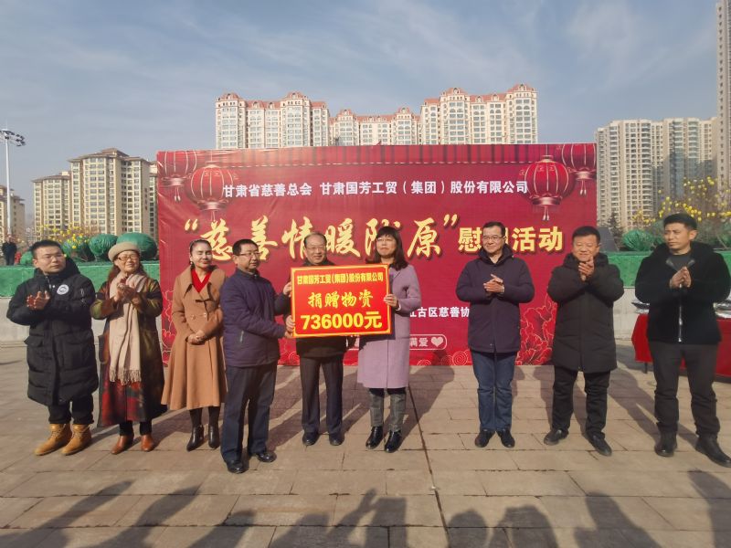 2020年1月14日,甘肅省慈善總會、蘭州市慈善會以及紅古區(qū)民政局?jǐn)y甘肅國芳工貿(mào)(集團(tuán))股份有限公司在蘭州市紅古區(qū)海石廣場共同舉行“慈善情暖隴原”暨物資捐贈活動,將2000件棉衣,1200余件秋褲,2000余件保溫杯以及1000余件棉拖合計價值73.6萬元的過冬物資帶給蘭州市紅古區(qū)的困難群眾。